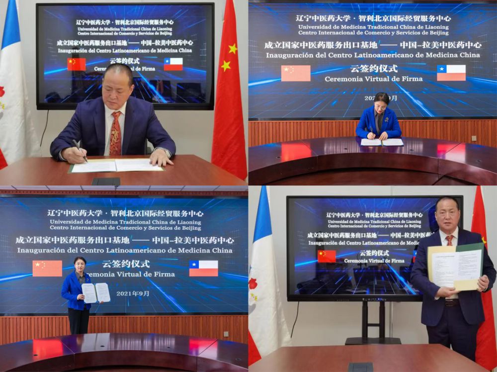 智利时间9月29日,智利北京国际经贸服务中心与辽宁中医药大学,为贯彻习近平总书记在2020年中国国际服务贸易交易会致辞中关于拓展特色服务出口基地的重要讲话精神,落实好党中央,国务院关于建设中医药服务出口基地的战略部署,以推动中医药事业传承、创新发展为原则达,在智利首都圣地亚哥成立国家中医药服务出口基地——中国-拉美中医药中心,双方云签约仪式顺利举办。